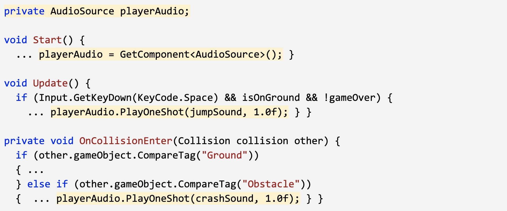 - 새로 private AudioSource playerAudio;를 선언하고, playerAudio = GetComponent<AudioSource>();로 초기화해주세요.