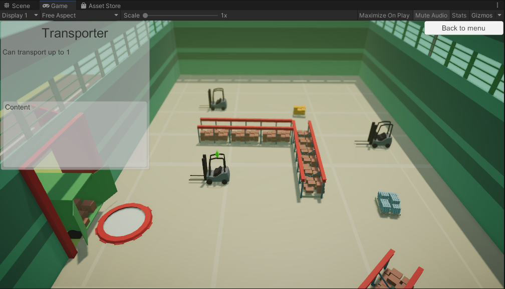 6. 운송 장비들을 사용해 어떤 일을 할 수 있는지 실험해보세요! 운송 장비 하나를 창고의 다른 장소로 이동시켜보거나, 작업 중인 상태일 때 연결된 자원 더미를 바꿔보세요.