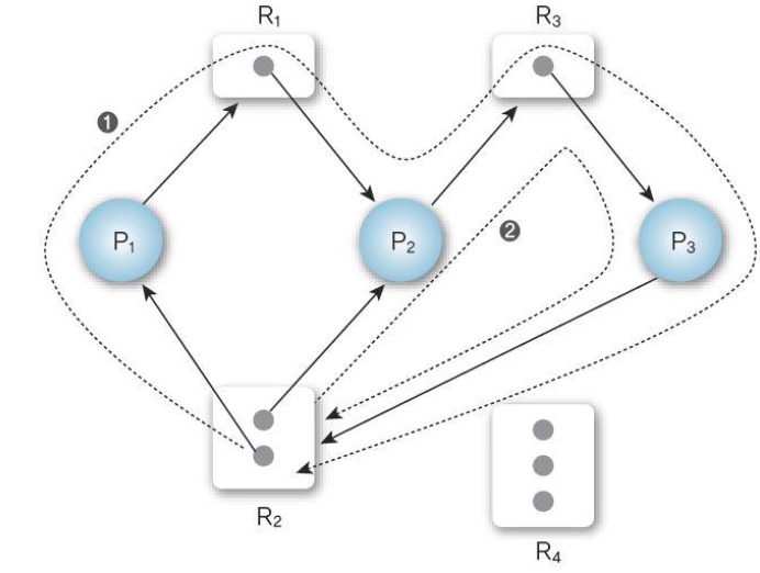 - 순환 대기(circular wait): 대기 프로세스 집합이 있을 때, P0은 P1이 점유하고 있는 자원을, P1은 P2가 점유하고 있는 자원을 Pn-1은 P0이 점유하고 있는 자원을 대기한다. (점유-대기 사이클 형성)