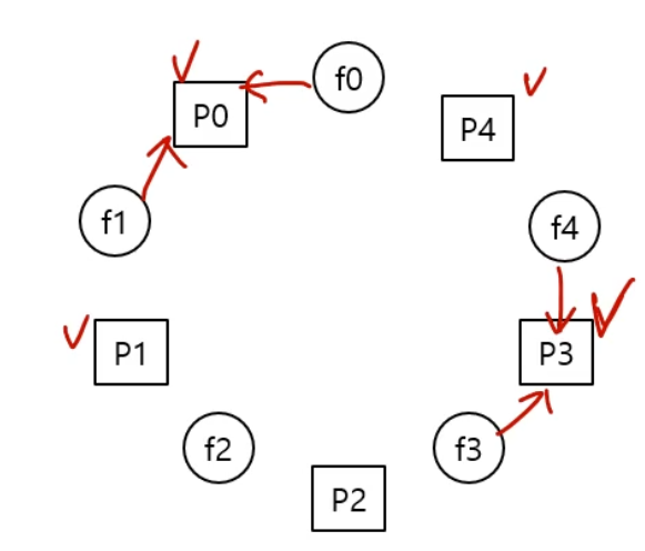 - P4는 f4와 f0이 이미 P3, P0에게 할당되어 있으므로, 식사를 할 수 없다.