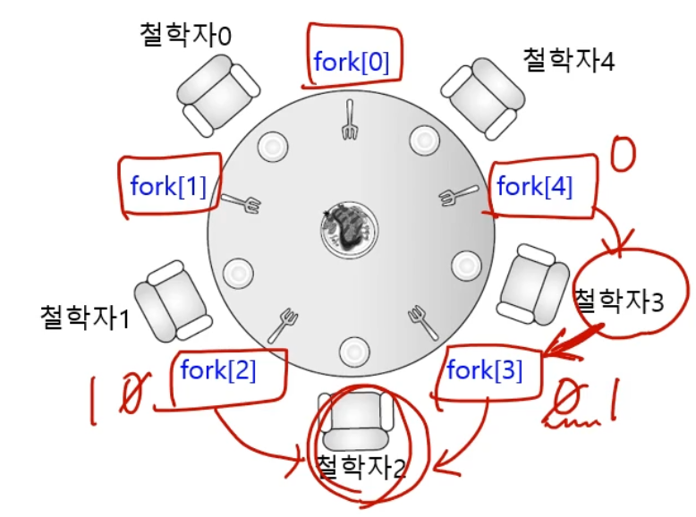 - 철학자 3은 철학자 2가 이미 P연산을 통해 fork[3]을 집었으므로, 식사를 시작할 수 없다.