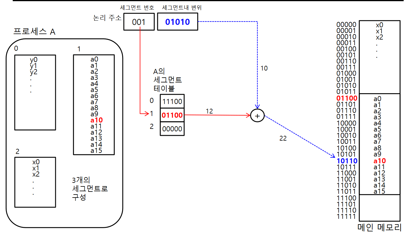 1개의 프로세스에 여러 세그먼트가 있을 때, 각 세그먼트는 연속된 메모리 공간에 할당되지만, 세그먼트끼리는 메모리에 연속일 필요가 없다.