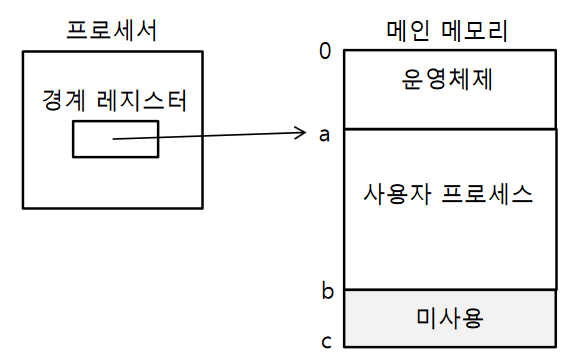 - 경계 레지스터: 운영체제 영역의 끝을 가리키고 있으며, 사용자 프로세스가 경계 레지스터의 주소 값보다 작은 주소를 참조하고자 하면 오류를 발생시킨다.