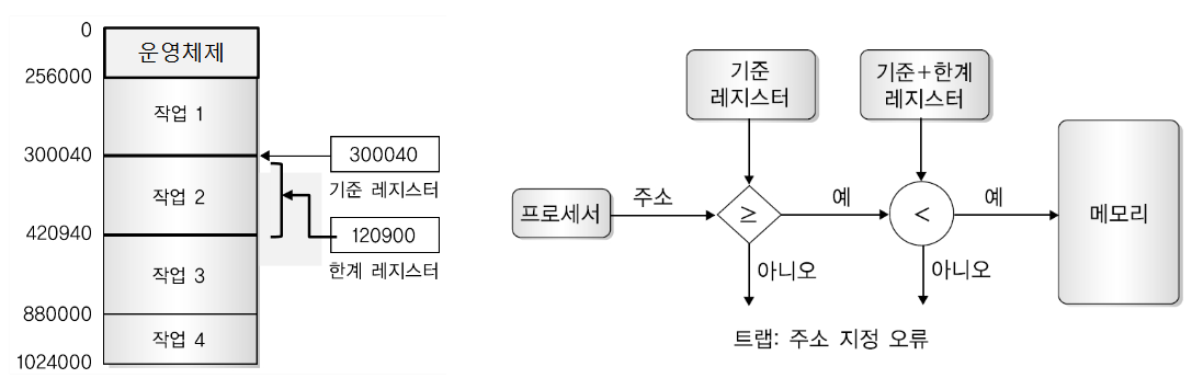 프로세서가 실행 중인 사용자 프로세스가 기준 레지스터 이상 ~ 기준+한계 레지스터 미만의 주소를 요청했을 때만 메인 메모리에 접근할 수 있도록 허용한다.