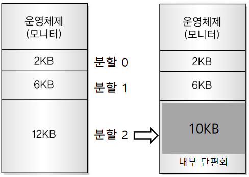 이는 고정된 크기로 메모리를 먼저 분할하고 분할된 크기 이하인 프로세스라면 해당 프로세스가 실질적으로 사용하는 메모리 공간을 고려하지 않고 무조건 할당하기 때문이다.