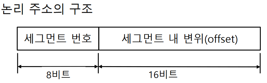 논리적 주소 = 18bits의 세그먼트 번호, 16bit의 세그먼트 오프셋으로 구성된다.
