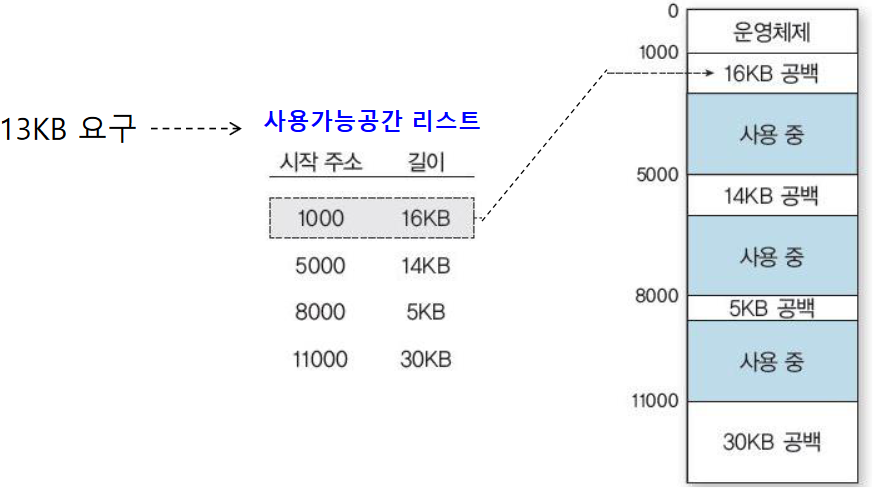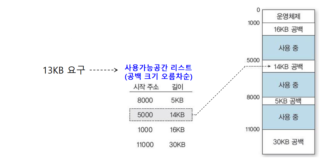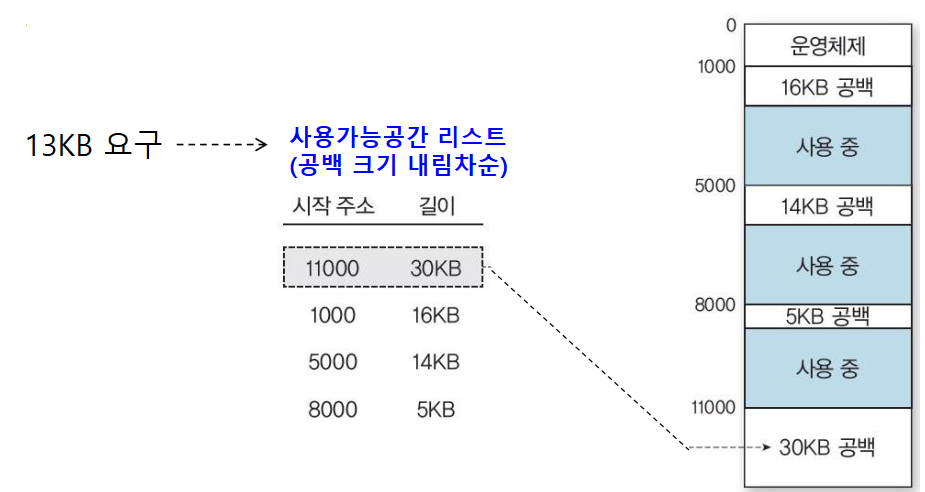 최초 적합(First-Fit), 최적 적합(Best-Fit), 최악 적합(Worst-Fit) 등이 있다.