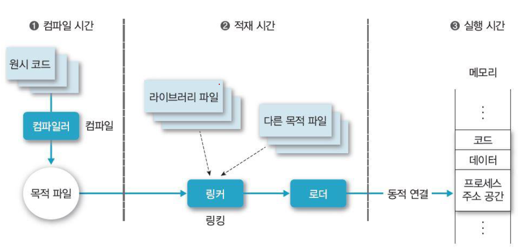 - 컴파일 시간 바인딩: 원시 코드가 컴파일되어 목적 파일로 변환되는 단계에서 컴파일러가 절대 주소를 생성한다.