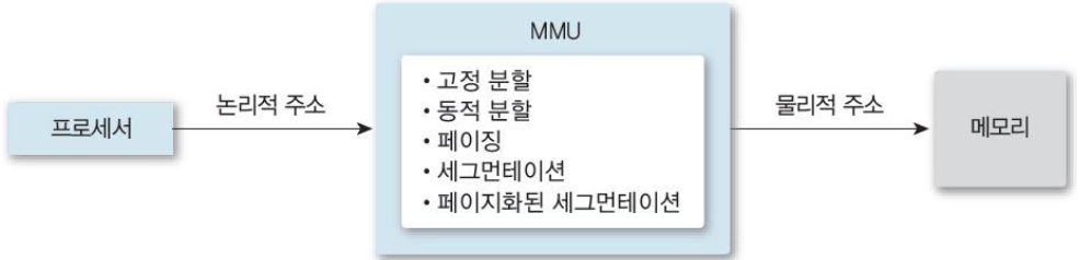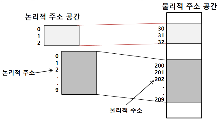 프로세서가 프로세스를 실행하려면, 그 프로세스의 논리적 주소에 대한 물리적 주소가 정해져야 한다.