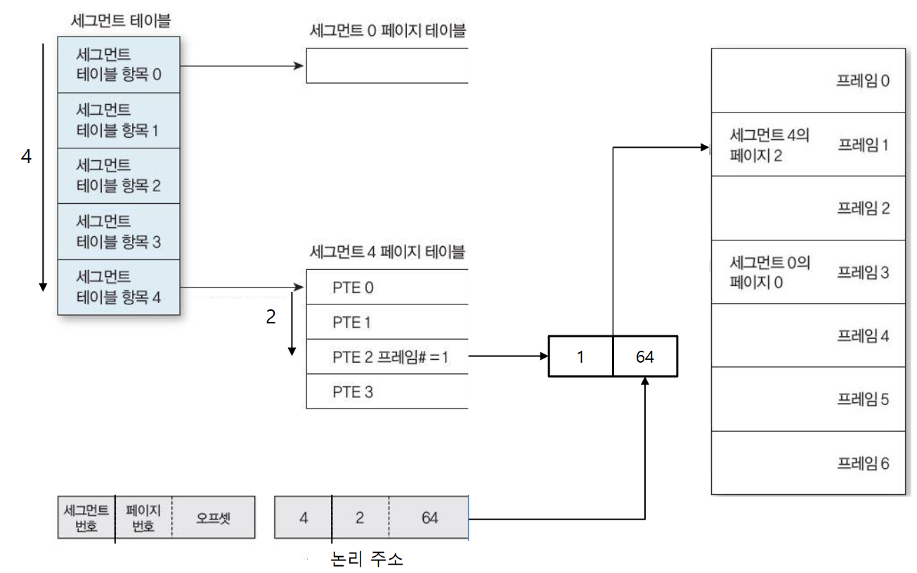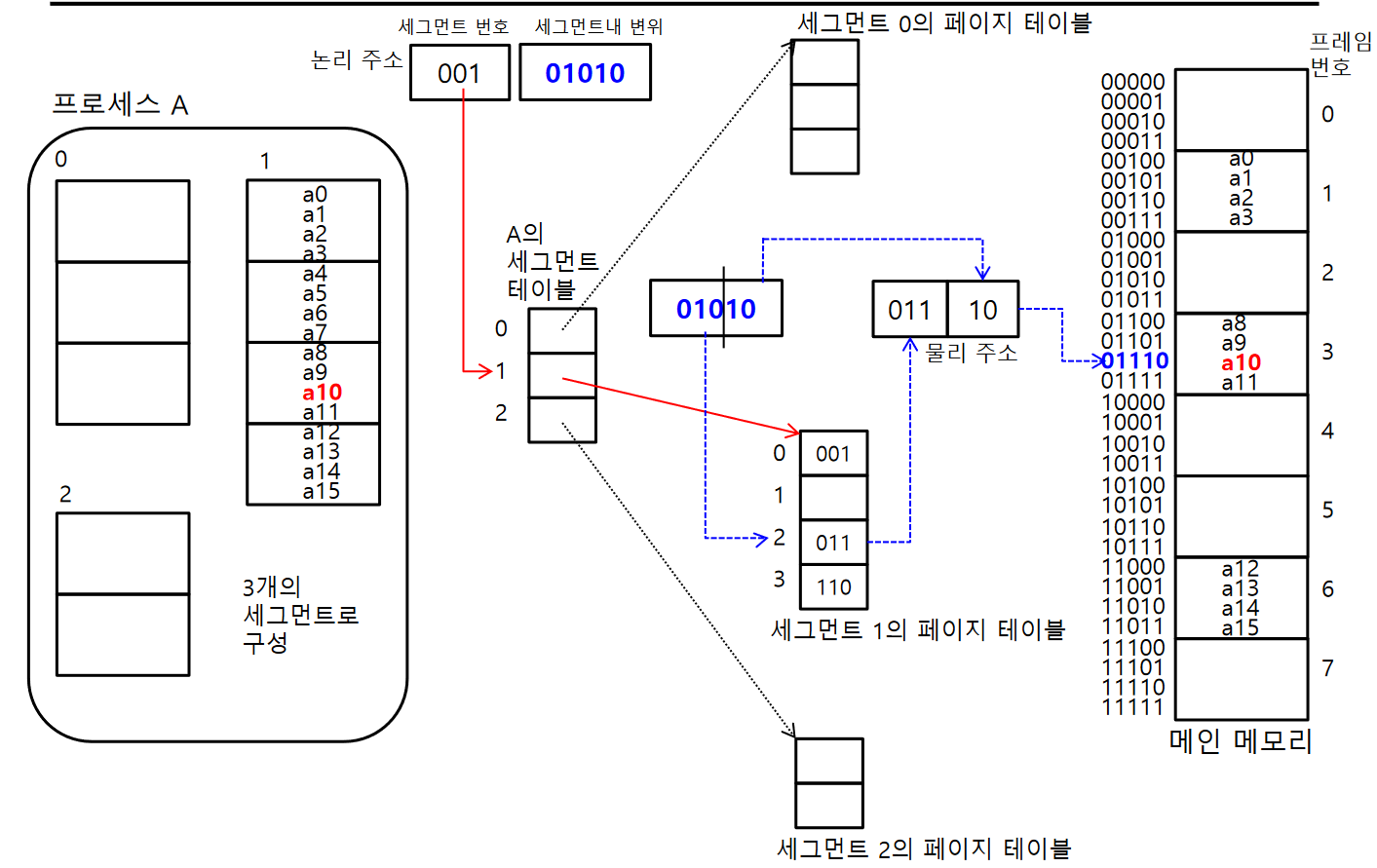 각 프로세스는 1개의 세그먼트 테이블을 가지며, 각 세그먼트는 자신의 페이지 테이블을 가진다.