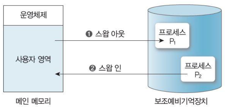 - 스왑 인(Swap In): 프로세스가 다시 작업을 수행해야 하면 메모리에 다시 올라와 실행된다.