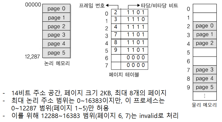 페이지 접근 허용 여부를 결정하려면, 페이지 테이블에 valid/invalid 비트를 두어 각 페이지 접근이 타당한가를 확인하면 된다.
