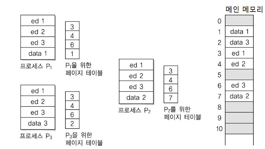 코드 페이지 ed1, ed2, ed3는 프로세스들이 공유하며, 데이터 페이지는 각자 따로 가진다.