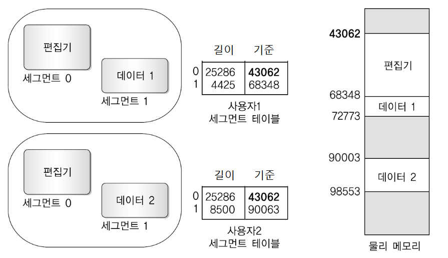 Ex) 문서 편집기의 코드를 공유할 때, 각 세그먼트 테이블에서 메모리의 같은 세그먼트(43062)를 지정한다.