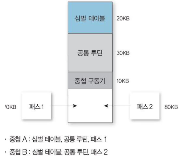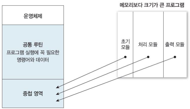메모리보다 크기가 큰 프로그램들 중에서 동시에 실행될 필요가 없는 모듈들은 중첩 영역을 공유해 조건에 맞게 모듈을 1개씩 불러와 사용하는 방식이다.