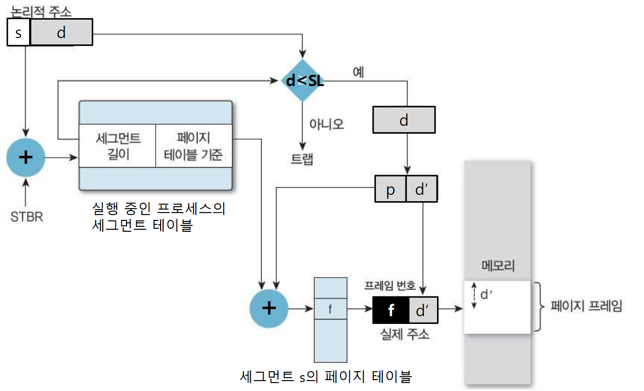 세그먼트 오프셋의 상위 비트, 페이지 번호(p) + 세그먼트 테이블 기준 레지스터 값 == 프레임 번호(f)