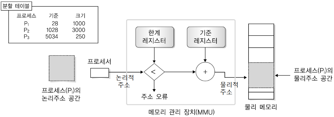 - 한계 레지스터: 분할의 크기를 나타내는 물리 메모리 주소