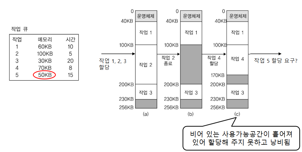 메모리의 빈 공간들이 흩어져 있고, 각각의 공간들 크기가 너무 작아서 세그먼트를 수용할 수 없는 문제가 발생할 수 있다.