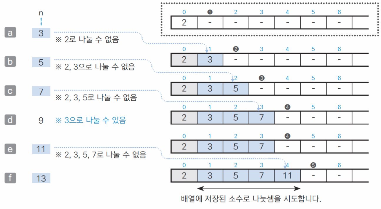 소수를 구하는 과정에서 지금까지 구한 소수를 배열의 원소로 저장한다.