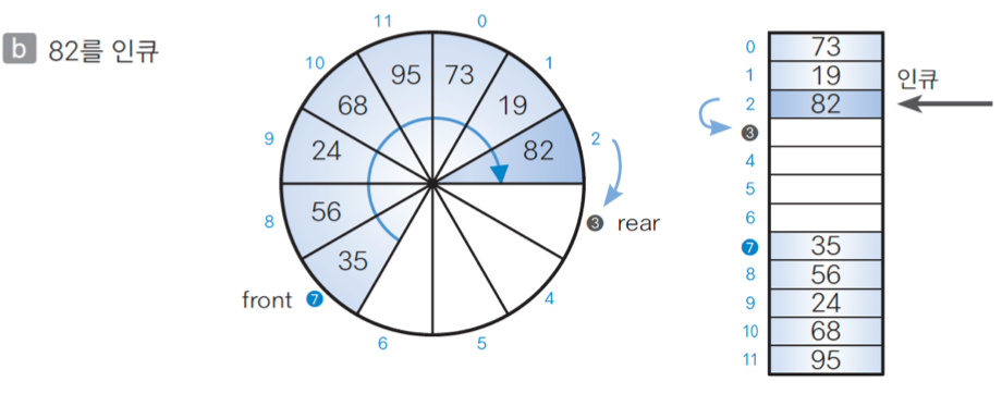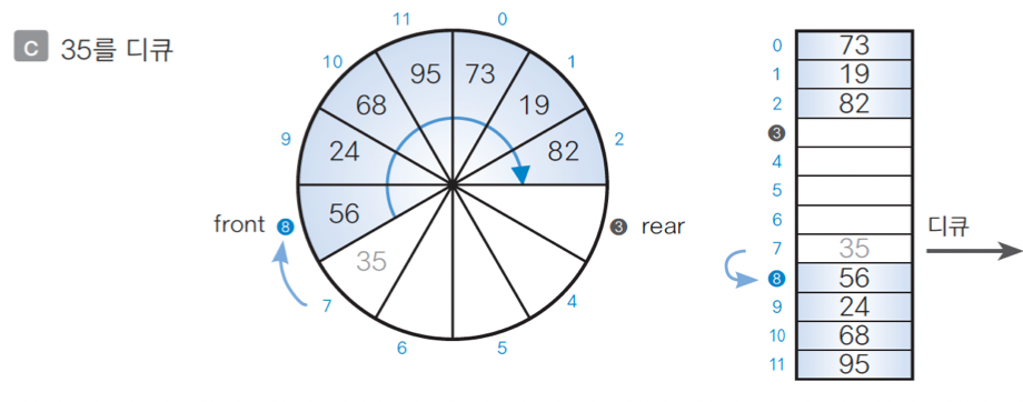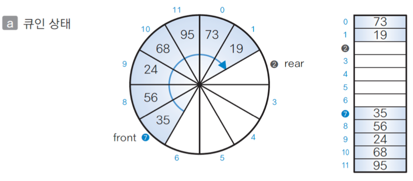 큐인 상태 (Capacity == 12)일 경우, 35, 56, 24, 68, 95, 73, 19가 que[7], que[8], ~, que[0], que[1]에 저장된다.