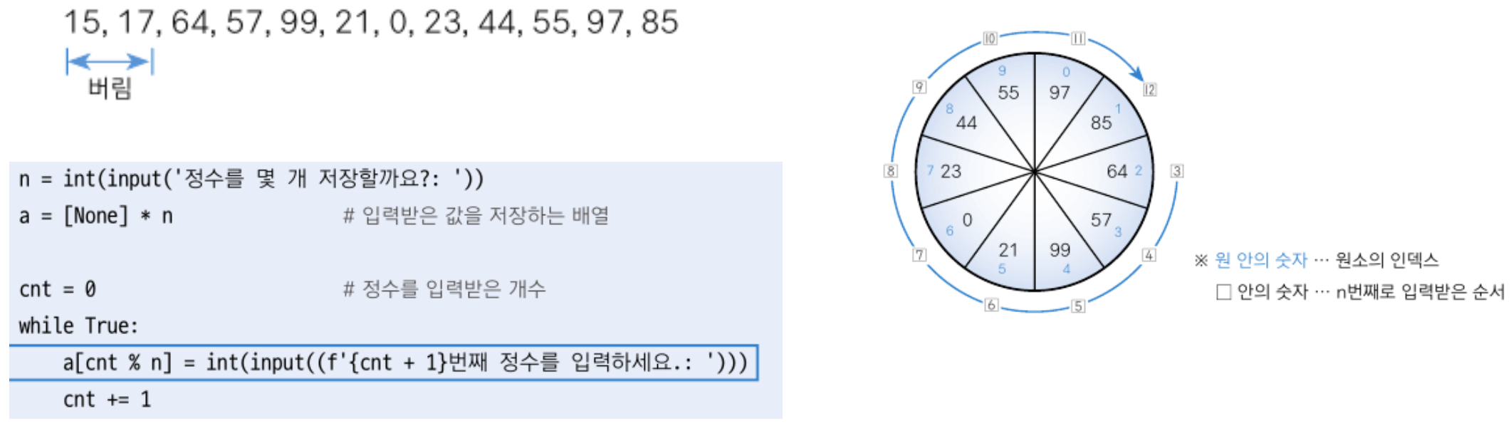 원소 수가 n인 배열에 가장 최근 입력된 n개의 데이터만 저장하고 오래된 데이터는 버린다.