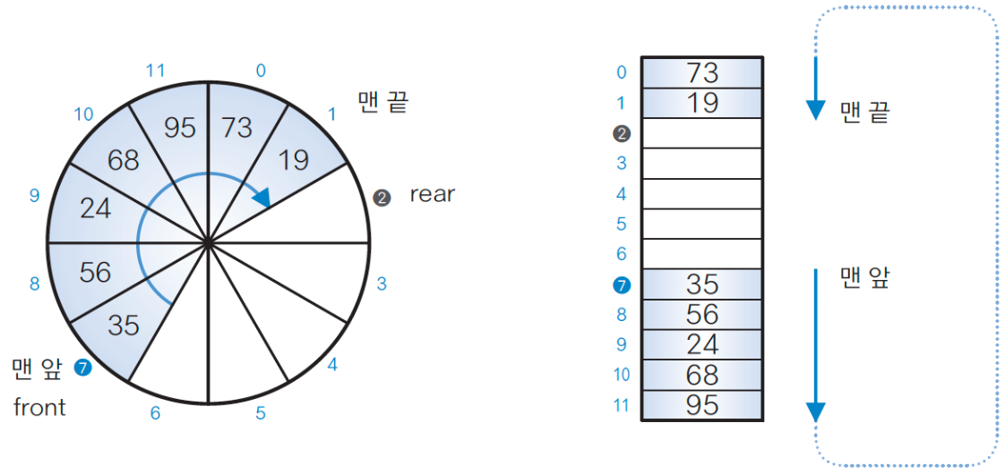 배열 맨 끝의 원소 뒤에 맨 앞의 원소가 연결되는 링 형태의 자료구조.