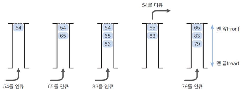- 프런트(Front): 큐의 맨 앞 원소 (데이터를 꺼내는 쪽)