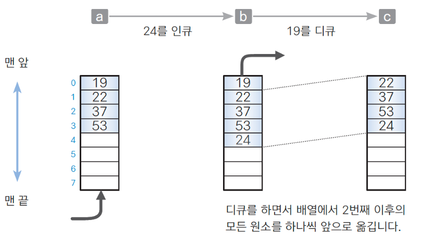 맨 앞 데이터 que[0]을 꺼내고, 모든 원소를 앞으로 이동시킨다.