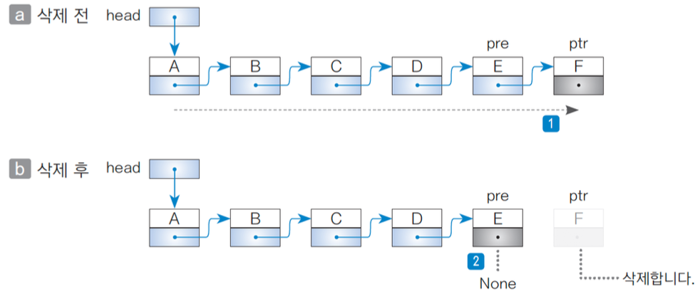 Node형 변수 p가 리스트에 있는 노드를 참조할 때, p의 next 필드가 None이면 p는 꼬리 노드이다.