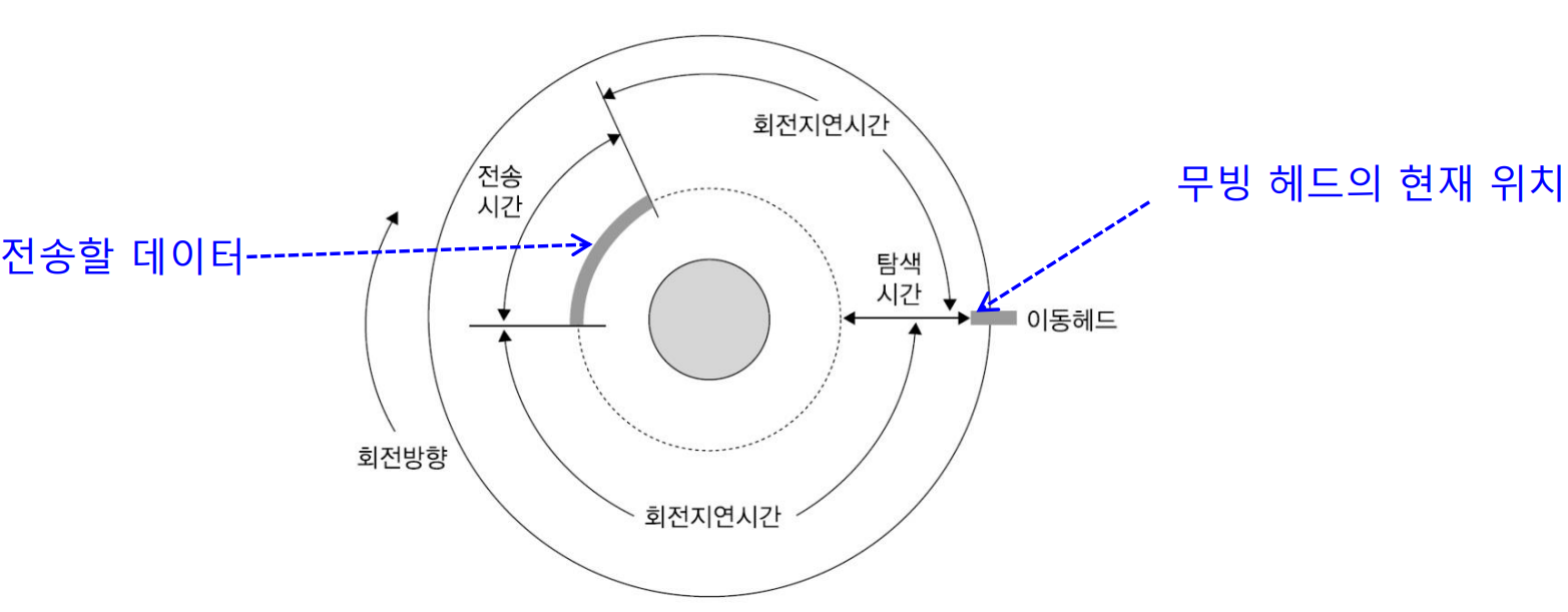 - 회전 지연 시간(Rotational Latency Time) - 섹터 이동: 원하는 섹터가 입출력 헤드 아래로 오도록 회전하는데 소요되는 시간