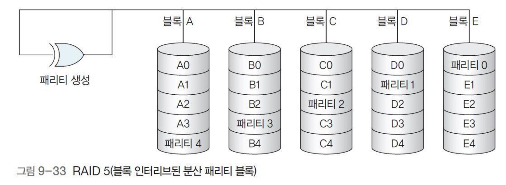 데이터를 여러 디스크에 분산 저장하되, 오류 탐지를 위한 패리티(Parity) 정보를 모든 디스크에 나눠 저장하는 방법.