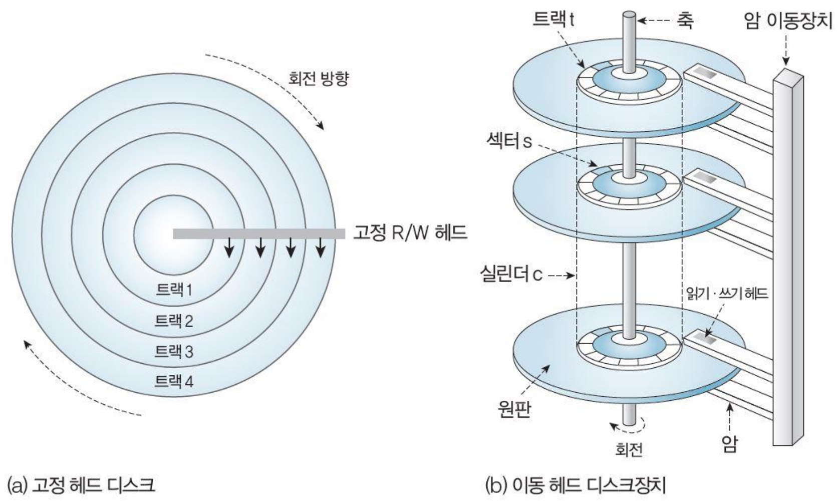 고정 헤드 디스크, 이동 헤드 디스크 등이 있다.