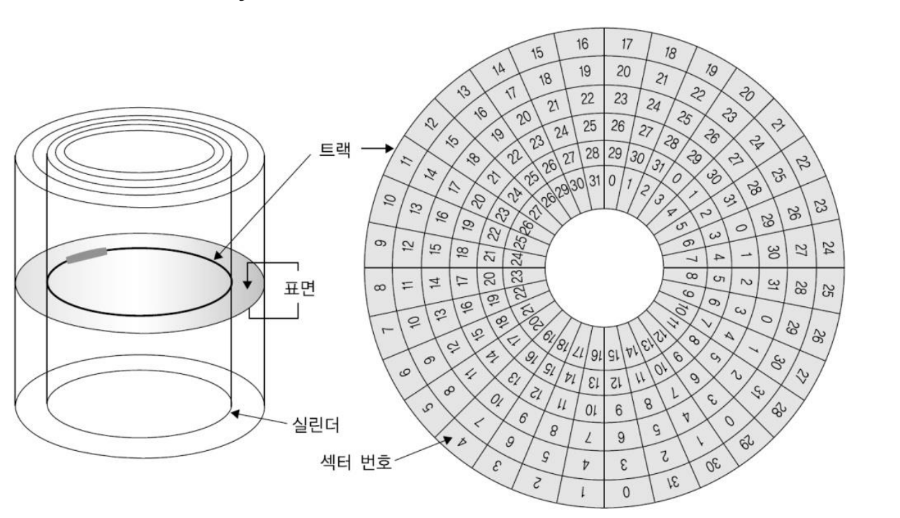 - 섹터(Sector): 디스크 입출력이 가능한 가장 작은 단위 (트랙 내의 정보는 섹터로 구분)