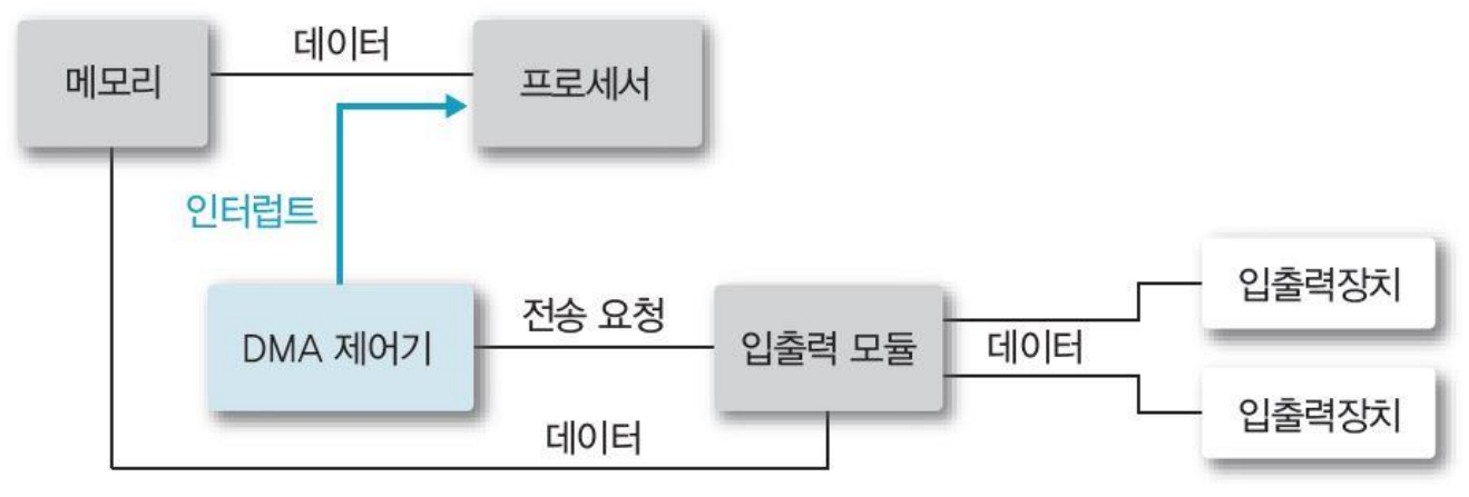 전송을 완료하면, 입출력 모듈이 프로세서에 인터럽트를 발생하여 입출력 종료를 알린다.