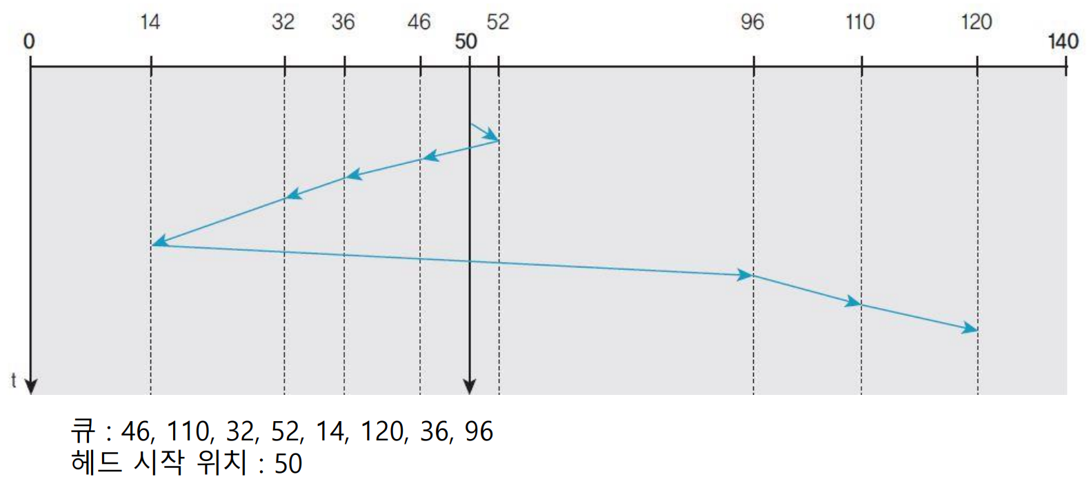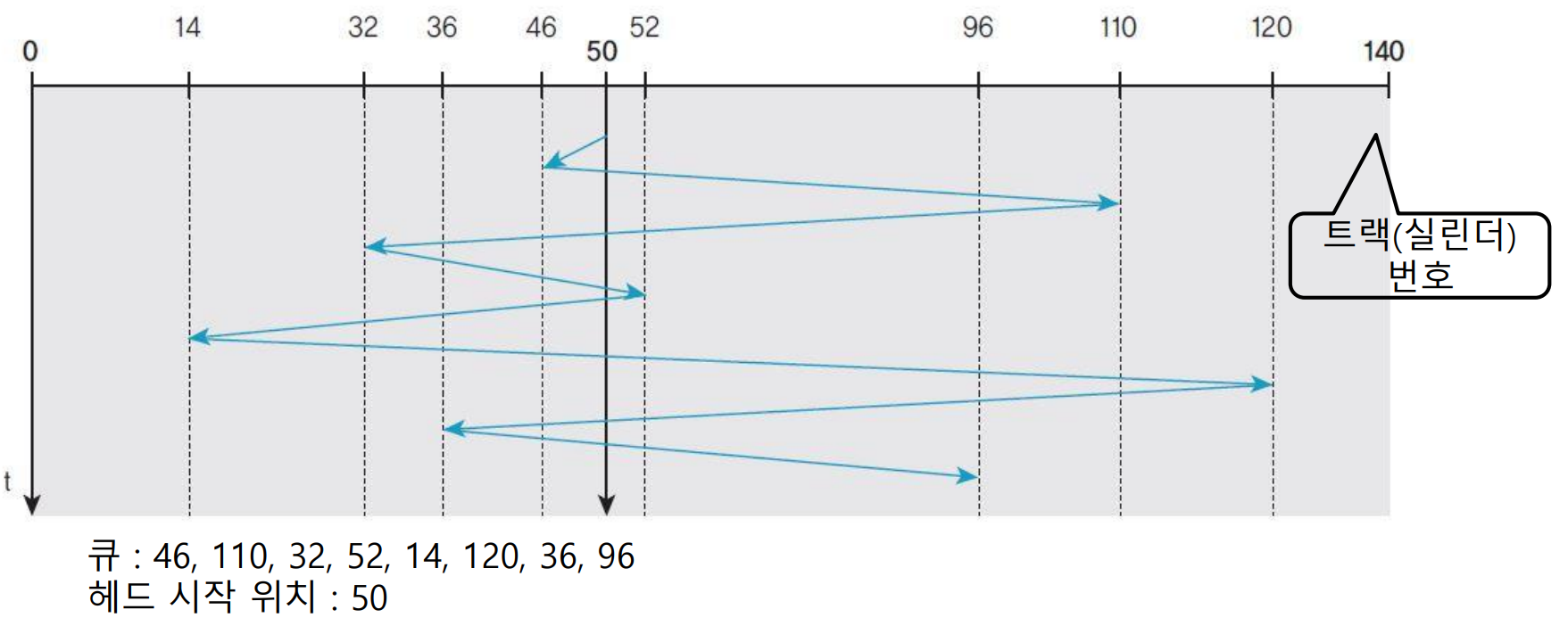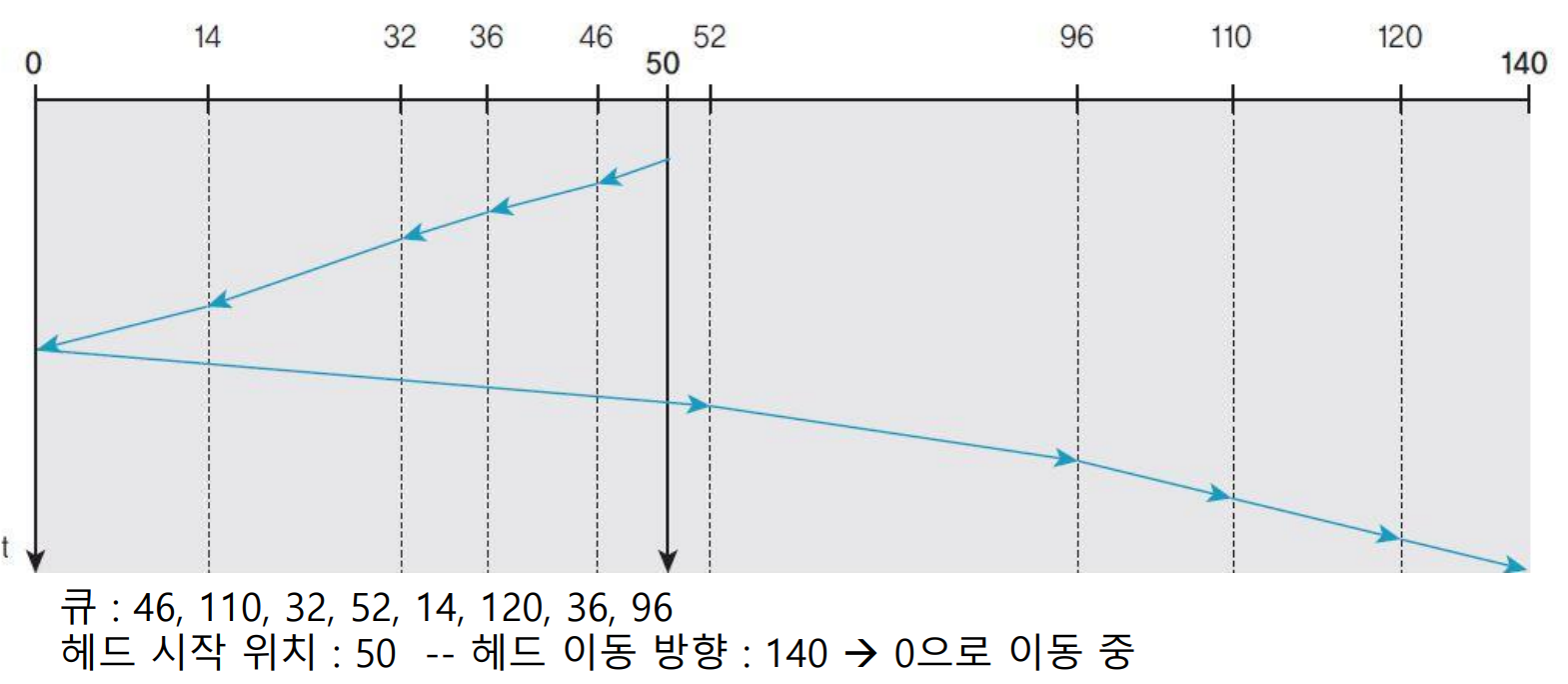 디스크 한쪽 끝 트랙에서 다른 쪽 끝 트랙까지 헤드가 왕복 이동하면서 요청을 처리한다.