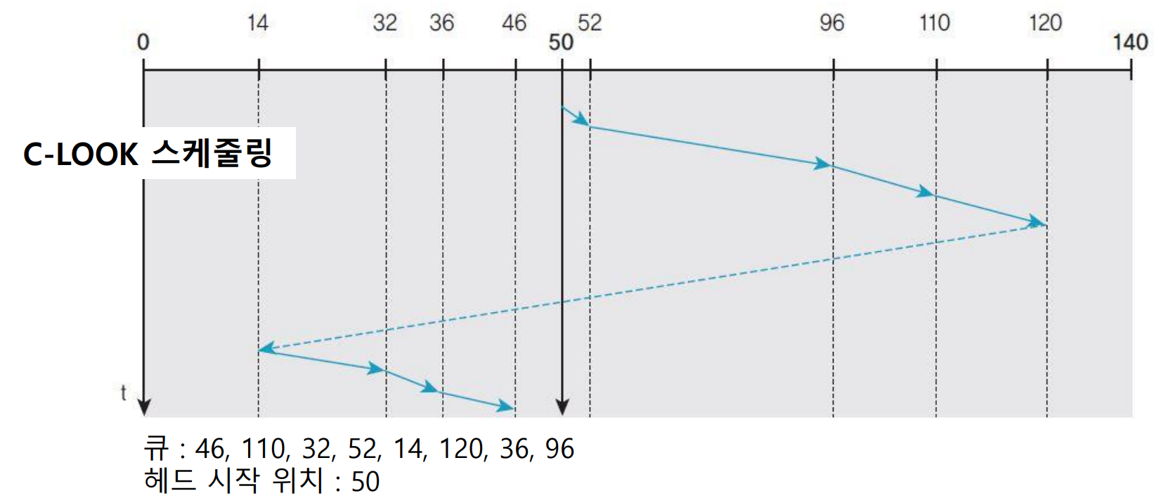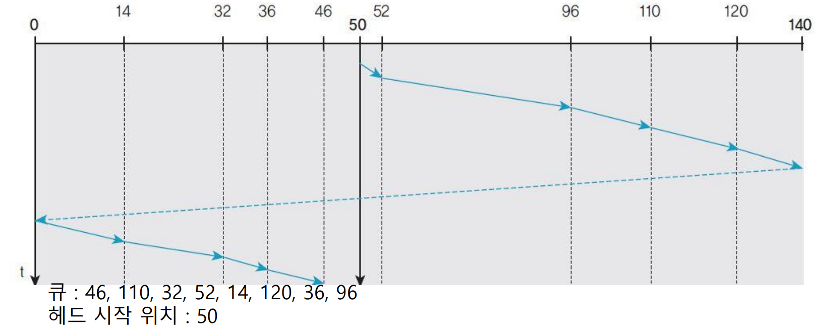 헤드 이동 방향의 뒤쪽에 도착하는 요청은 헤드가 끝까지 이동한 후, 되돌아올 때까지 기다려야 한다.