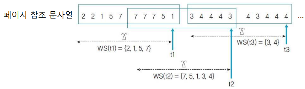 프로세스의 작업 집합(w, t) == 시간 (t-w)부터 t까지의 프로세스 시간 간격에 참조한 페이지들의 집합