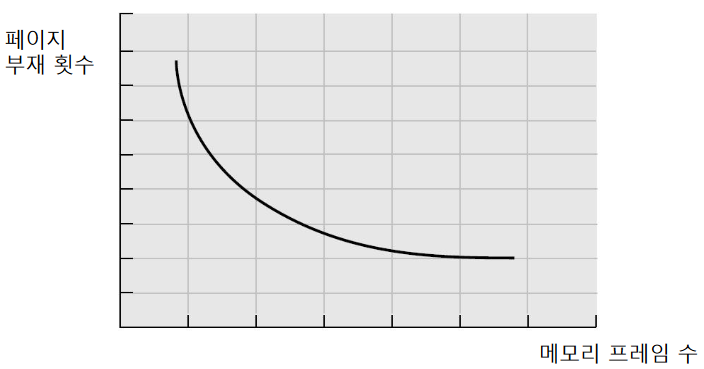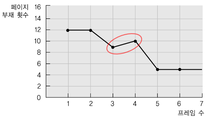 일반적으로 메모리 프레임 수가 증가하면, 페이지 부재 횟수는 감소한다.