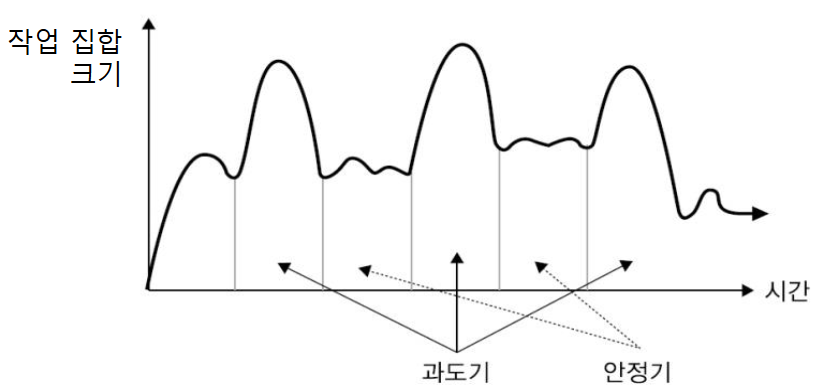 작업 집합이 가장 커지는 시기를 과도기, 작업 집합 크기 변동이 완만한 시기를 안정기라고 부른다.