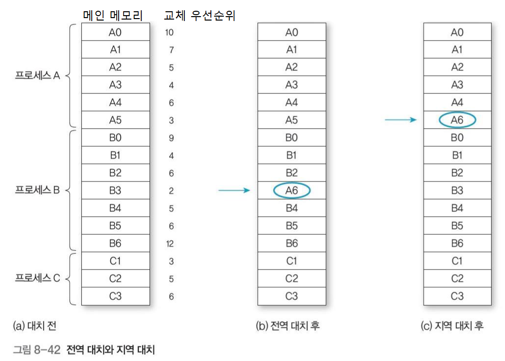 페이지 교체 범위를 모든 프로세스로 확대하여 프로세스가 교체할 프레임을 다른 프로세스에서도 찾을 수 있다.