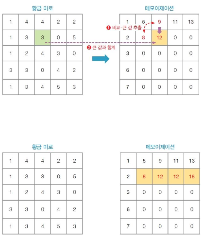 미로를 이동하면서 누적된 황금 개수를 채우기 위한 메모이제이션 배열을 작성한다.