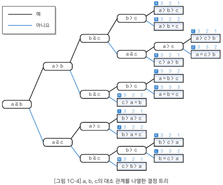 위의 세 정수의 최댓값 탐색 알고리즘을 결정 트리로 구현해보면 다음과 같다.