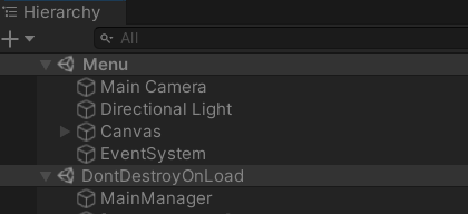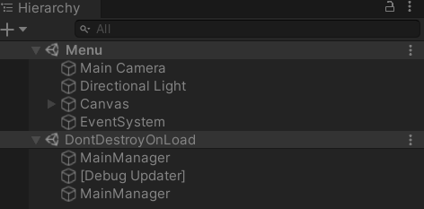 2. Hierarchy 창의 게임 오브젝트들을 확인해주세요. MainManager가 여러분의 일반 씬(Menu 씬)에서 DontDestroyOnLoad라는 특별한 씬으로 이동했습니다.