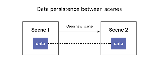 유니티 상에서 씬 내에서 생성된 데이터는 데이터를 생성한 해당 씬 내에서 쉽게 접근해 사용할 수 있습니다. 하지만 사용자가 다른 씬으로 넘어가게 되면 어떻게 될까요? 일반적으로, 해당 데이터는 손실됩니다. 씬 사이의 데이터 지속성은 사용자가 여러분의 애플리케이션을 사용하는 동안, 사용자에게 동일한 경험을 제공하도록 씬에서 씬으로 데이터를 전달하는 프로세스입니다. 위의 첫 2가지 예시는 씬 사이의 데이터 지속성의 예시입니다. - 일반적으로 씬 여러 개를 사용하는 단일 세션 경험입니다.