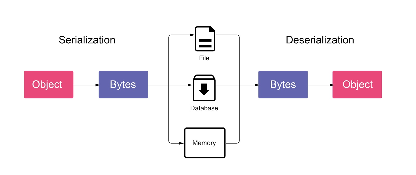 복잡한 데이터를 저장할 수 있는 포맷으로 변환하는 과정을 직렬화(Serialization)라고 부릅니다. 데이터에 다시 접근할 준비가 되었을 때, 저장된 데이터를 다시 변환하는 과정을 역질렬화(deserialization)라고 부릅니다.
