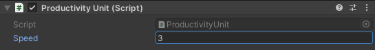 7. ProductivityUnit 스크립트를 프리팹에 추가하세요. 클래스가 Unit 클래스의 자식 클래스이기 때문에, 자동으로 속도를 제어하는 데 쓰이는 public float 변수가 제공됩니다.