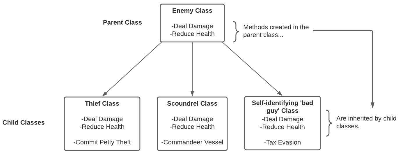 위의 예제 코드를 보면, Enemy 클래스는 호출될 때마다 플레이어의 체력을 10점씩 감소시키는 DealDamage 메서드를 가지고 있습니다. Enemy 클래스의 자식 클래스인 Thief 클래스는 클래스 내에서 따로 선언할 필요 없이 바로 이 메서드를 호출할 수 있습니다.