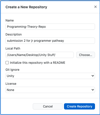 1. "Programming-Theory-Repo"와 같은 형태의 이름으로 새로운 리포지토리를 Unity용으로 생성합니다.