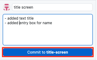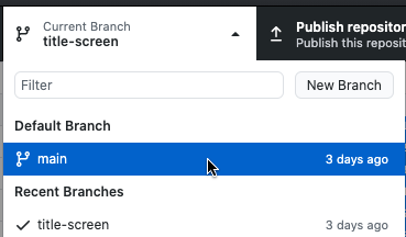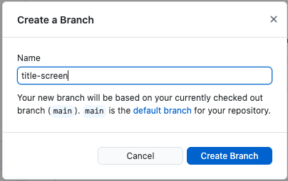 1. 여러분의 리포지토리 안에 새로운 브랜치를 생성하고 이름을 "title-screen" 형식으로 설정합니다. 새로운 브랜치를 어떻게 생성하는지 잘 모르시겠다면 GitHub의 설명서를 참고해주세요. 해당 브랜치에서는, 다른 개발자의 작업물에 어떠한 영향도 받지 않고 안전하게 새로운 기능을 실험해볼 수 있습니다.