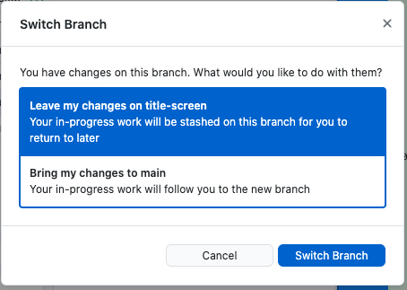 만약 여러분이 마지막 커밋 이후에 프로젝트를 수정하신 경우, 브랜치 상에 "변경 사항 그대로 두기(Leave changes)" 옵션과 메인 브랜치로 "변경 사항 가져오기(Bring changes)" 옵션 중에 하나를 선택할 수 있는 창이 표시될 것입니다. 이는 여러분의 브랜치에 대한 변경 사항들이 아직 커밋되지 않았음을 의미합니다. 우선 Cancel 버튼을 클릭하고, 모든 변경 사항들이 여러분의 브랜치 상에 커밋되었는지 확인하신 다음, 다시 메인 브랜치로 전환해주세요.